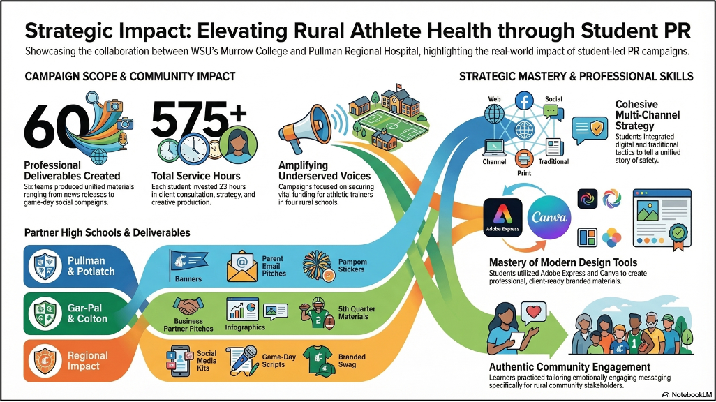 During the Fall 2025 semester, 25 PR majors enthusiastically worked on a service-learning partnership with Pullman Regional Hospital (PRH) and its Regional High School Athletic Training Program. Led by Stephanie Pierce, PRH’s Director of Development, the challenge was to bridge the funding and awareness gap for trainers in underserved rural regions including, Colton, Potlatch, Pullman and Garfield-Palouse.
