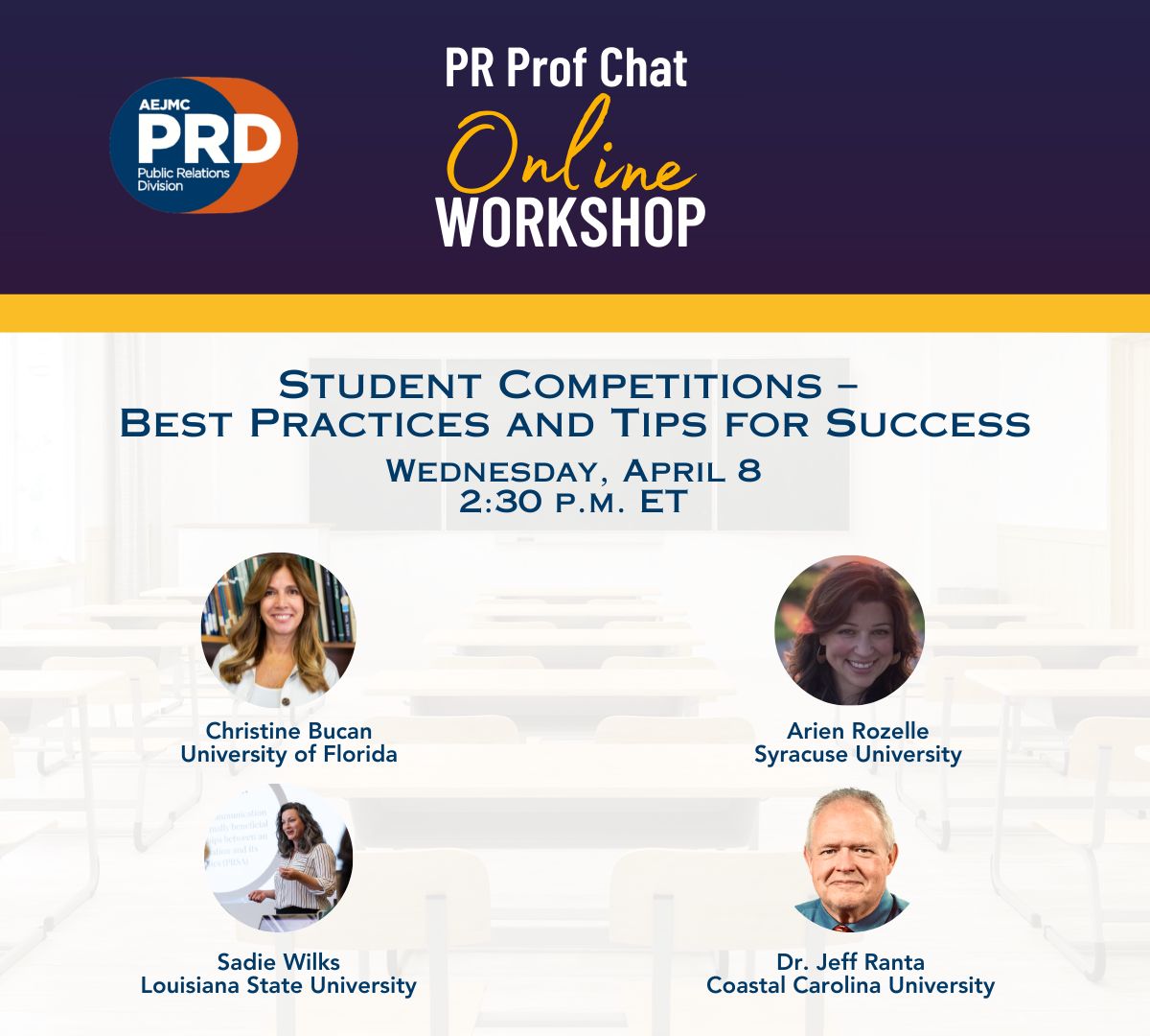 Greetings from the teaching committee of the PRD. Please join us on Wednesday, April 8 at 2:30 ET for an online session on student competitions. Our guests will be Christine Bucan of UFL, Arien Rozelle of Syracuse, Sadie Wilks of LSU and Jeff Ranta of Coastal Carolina.